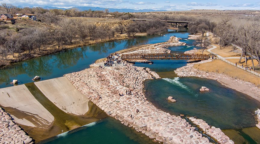 Pueblo Water spent about $11 million to turn a dangerous spot on the Arkansas River into a free, family-friendly, all-levels recreation area. The public utility replaced a small century-old diversion dam with wading ponds, tubing areas and whitewater challenges. Walking paths wind along the riverbanks and now two new pedestrian bridges cross the river.