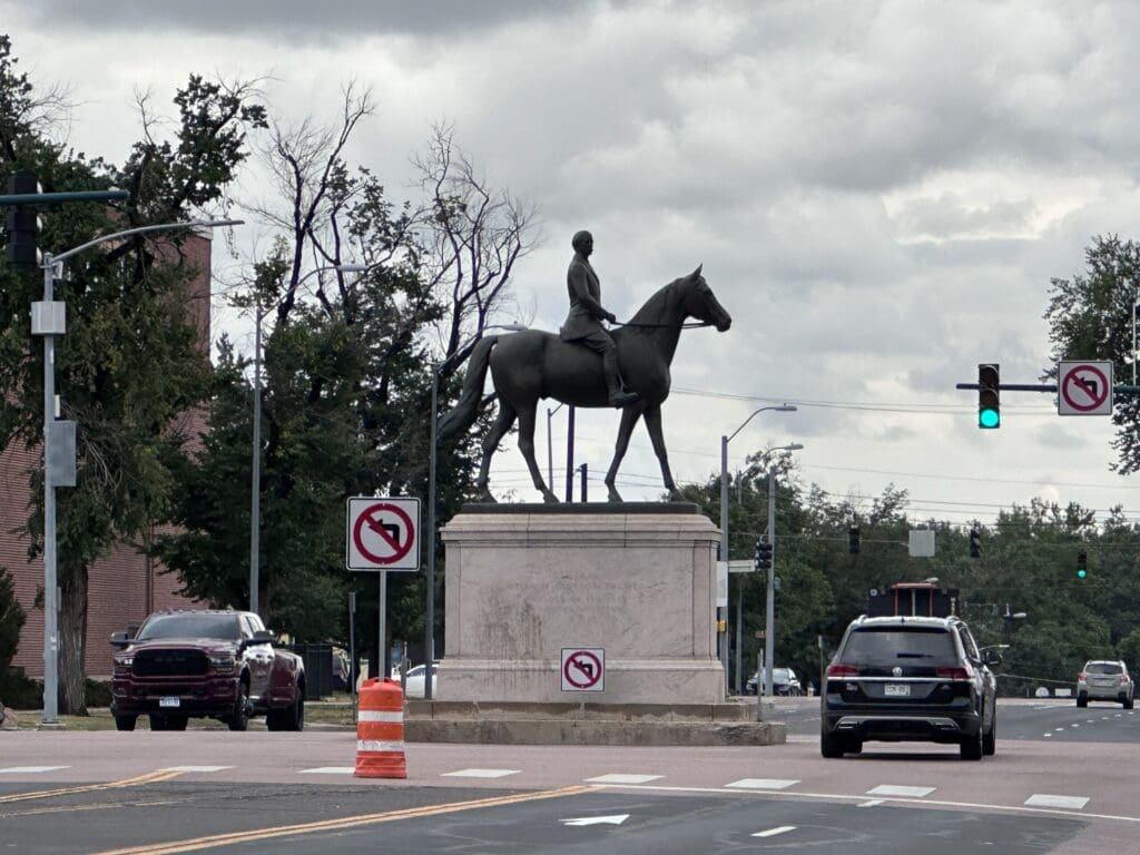 That’s because the intersection also pays tribute to the city’s founder, General William Jackson Palmer, with a large statue of him sitting tall upon his horse. The statue is in the middle of the intersection.
