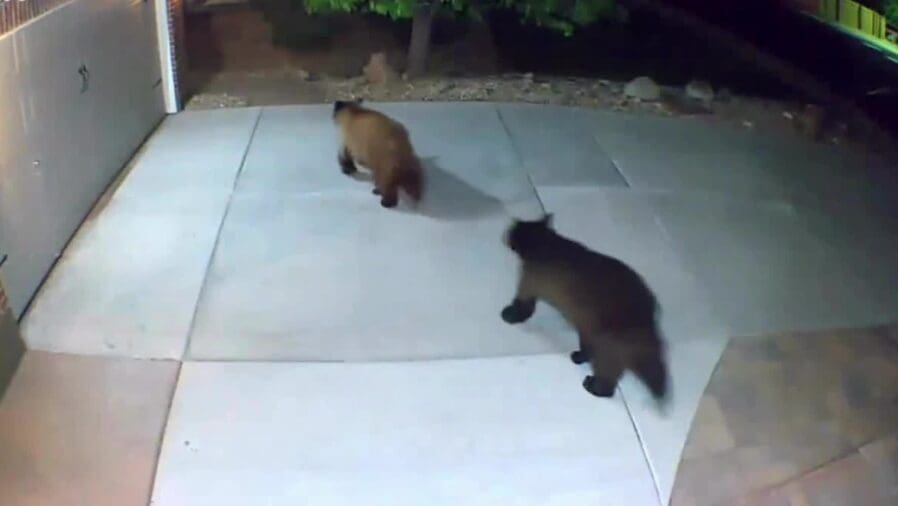 Two bears were seen roaming around the home, across the driveway and on the back porch and snooping in the trash cans.